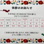 2025年12月6日 / 最終更新日 : 2025年12月6日 wpmaster お知らせ 2025年-2026年 年末年始休診期間のお知らせ 本年度の年末年始の休診を以下の日程で実施させていただきます。休診期間は2025年12月30日(火曜)~2026年1月4日(日曜)です。