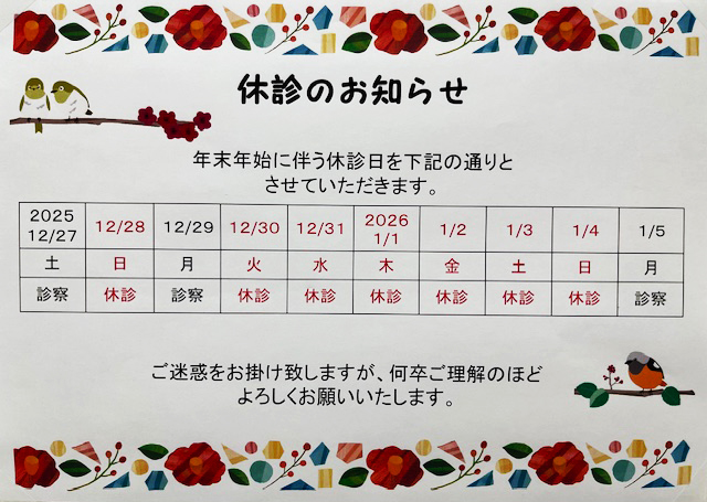 2025年12月6日 / 最終更新日 : 2025年12月6日 wpmaster お知らせ 2025年-2026年 年末年始休診期間のお知らせ 本年度の年末年始の休診を以下の日程で実施させていただきます。 休診の期間前後は大変混雑が予想されますので、必ずお電話でご確認・ご予約お願いします。 ■2025年-26年 年末年始休診期間のお知らせ 休診期間: 2025年12月30日(火曜)~2026年1月4日(日曜)まで 12月29日(月曜)は通常通りの診察を行います。 1月5日(月曜)以降は通常通りの診察を行います。 ご迷惑をおかけいたしますが、理解のほどよろしく願い申しあげます。